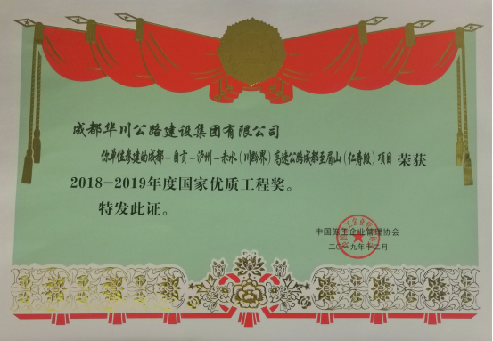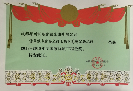集團在2018年組織申報的“大理-麗江高速公路”、“成都-自貢-瀘州-赤水高速成仁段”項目于今年12月分別榮獲“國家優(yōu)質(zhì)工程金獎”、“國家優(yōu)質(zhì)工程獎”兩項殊榮,實現(xiàn)了集團參建工程在國家優(yōu)質(zhì)工程(金)獎上的突破。此次獎項由集團總工辦全力申報。