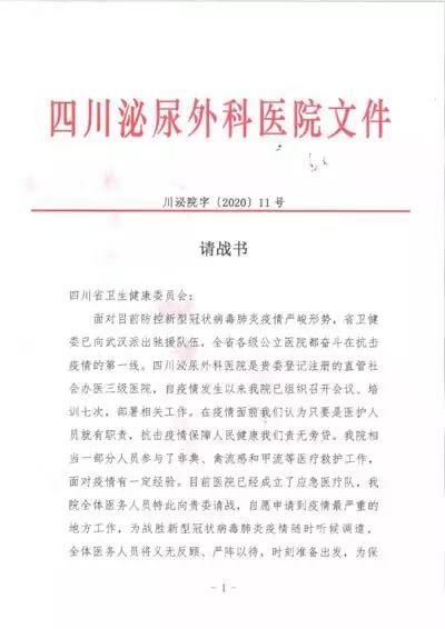 1月28日集團(tuán)旗下四川省泌尿外科醫(yī)院黨政工群各級(jí)領(lǐng)導(dǎo)干部、防控應(yīng)急醫(yī)療隊(duì)和醫(yī)院技術(shù)骨干100余人召開請戰(zhàn)大會(huì),主動(dòng)向省衛(wèi)健委請戰(zhàn)馳援武漢,請戰(zhàn)書已于當(dāng)日送達(dá),省衛(wèi)健委對(duì)醫(yī)護(hù)人員積極抗擊疫情給予肯定贊揚(yáng),并指示爭取第三批次派遣醫(yī)護(hù)人員前往疫區(qū)第一線。1月31日起,該院根據(jù)省中醫(yī)管理局公布的冬春季呼吸道傳染病預(yù)防建議處方,緊急熬制中藥湯劑,免費(fèi)向市民發(fā)放,每天限量供應(yīng)1000人份(6000袋)。