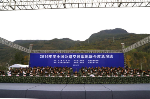 1月22日,由交通運輸部、四川省人民政府、武警交通指揮部聯(lián)合主辦的2016年度全國公路交通軍地聯(lián)合應(yīng)急演練在綿陽市平武縣南壩鎮(zhèn)隆重舉行。交通運輸部副部長戴東昌、四川省人民政府副省長楊洪波,武警部隊副參謀長趙建軍少將,武警交通指揮部司令員傅凌少將、參謀長高強少將等相關(guān)領(lǐng)導(dǎo)及集團董事長、總裁謝應(yīng)文,集團副總裁楊開榮出席并觀摩演練。